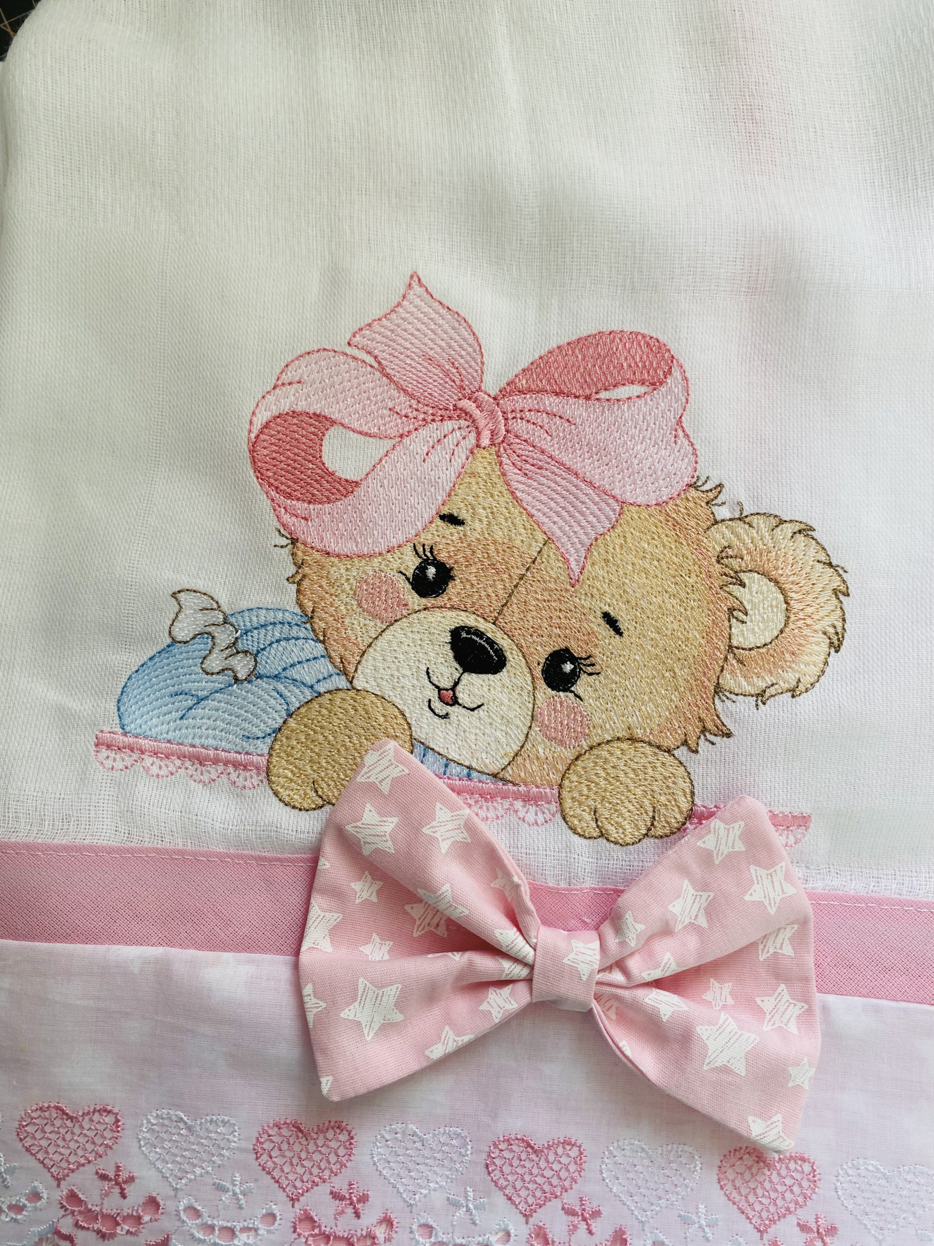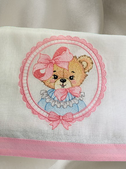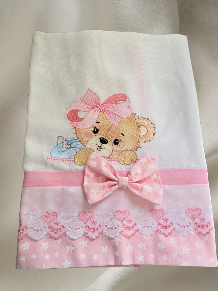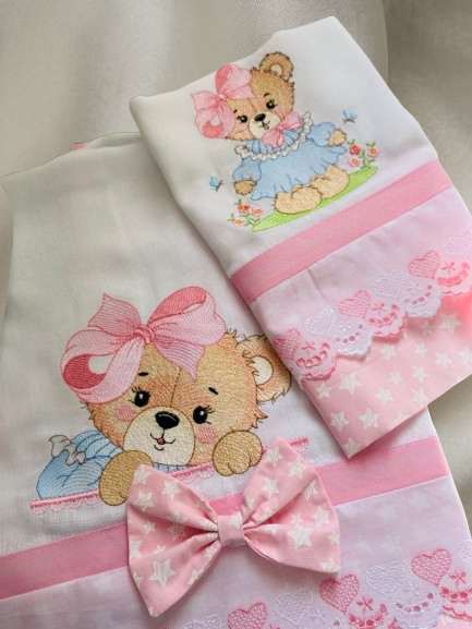 - Acabamento: O diferencial do produto é o bordado com o tema de ursa, que adiciona um toque personalizado e delicado ao enxoval do bebê.
