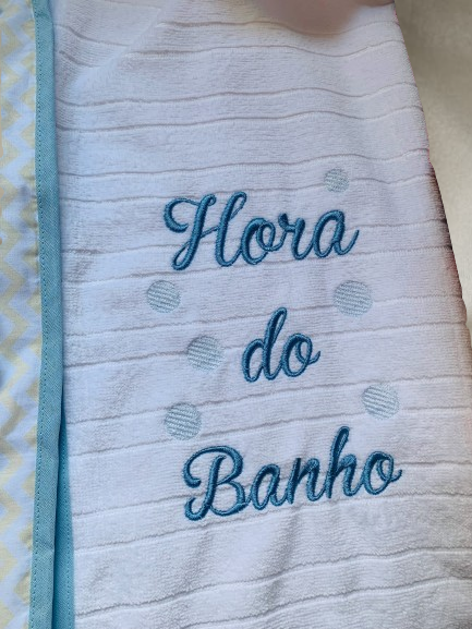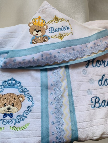 - Capuz personalizado: O capuz, também forrado com fralda, pode ser bordado com o nome do bebê e um tema Urso Rei, tornando a peça única e especial. É perfeito para proteger a cabecinha da criança após o banho.