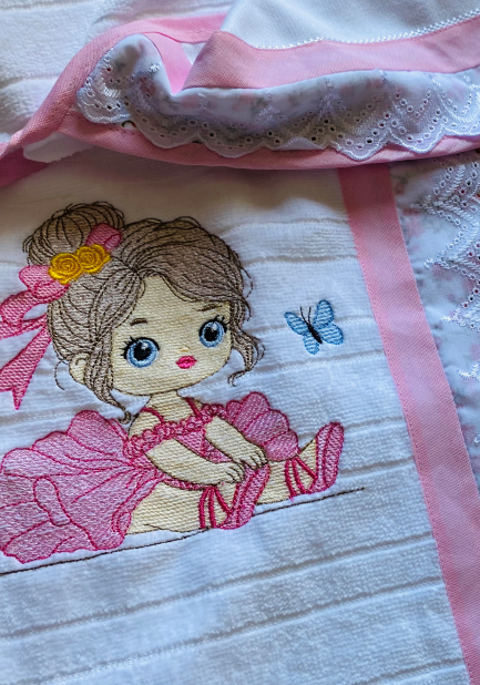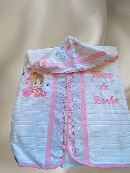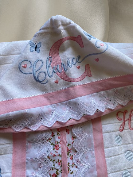 - Bordados nas laterais: Além do capuz, a toalha possui bordados delicados nas laterais, adicionando um toque de charme e exclusividade ao design.